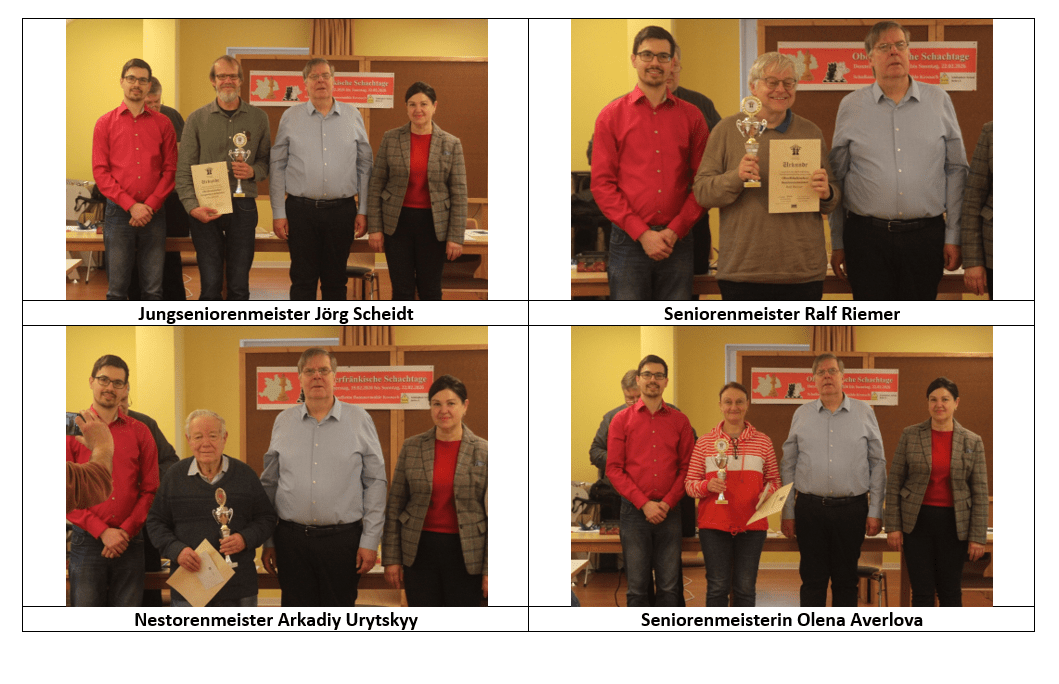 Gratulation an die neuen Oberfränkischen Senioren-Meister und die Platzierten. Die einzelnen Ergebnisse sind unter https://s1.chess-results.com/tnr1315617.aspx?lan=0&turdet=NO&SNode=S0  und auf der Internet-Seite der Oberfränkischen Schachtage zu finden.